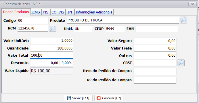 as demais informações como Código, Descrição do Produto, NCM, Valor Unitário e Quantidade, deve ser preenchido com as informações do produto da troca como pede o destinatário.