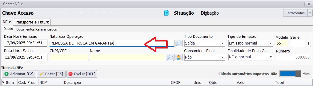 Para iniciar uma NF-e de troca em garantia, preecha a NATUREZA DE OPERAÇÃO, como abaixo: