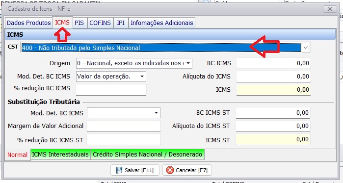 Após inserir os dados do produto clique na aba ICMS e mude o CST para 400 (Veja na imagem abaixo):